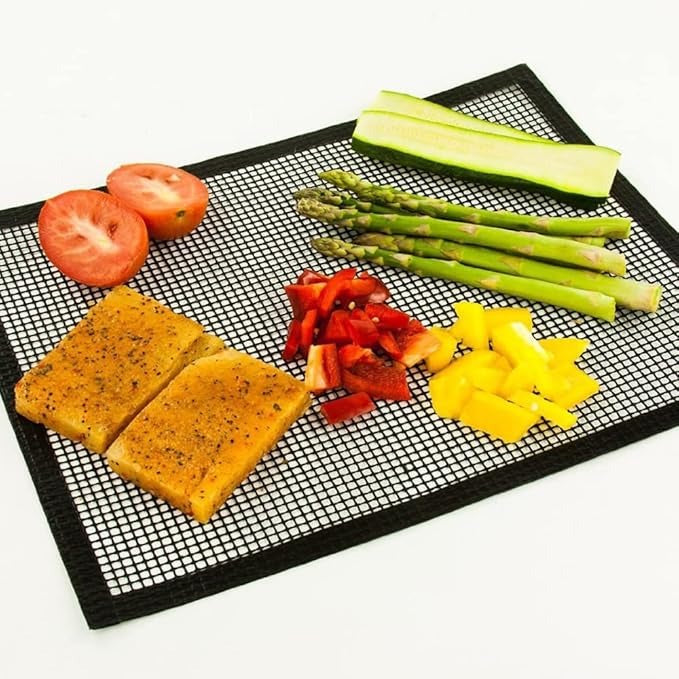 ·NON-STICK - Generously sized 13x16 inch grill topper is non-stick and made of a PTFE (PFOA FREE) coated mesh
