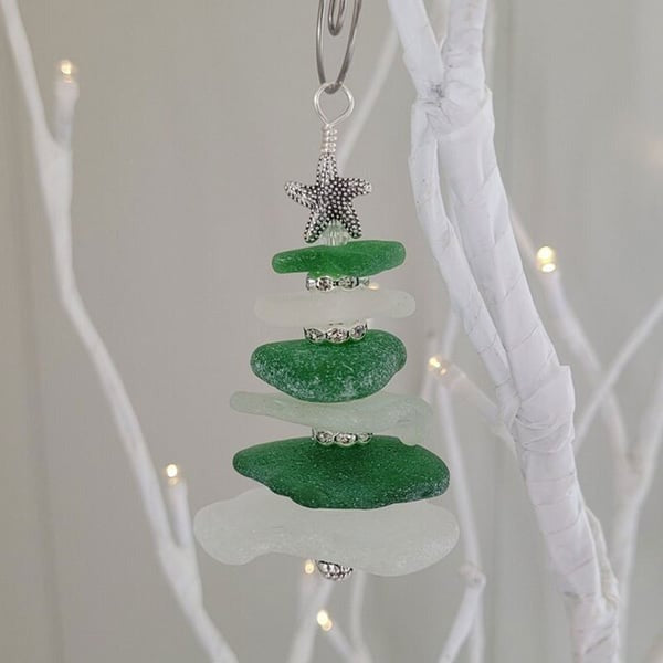 🎄Decorate your Christmas tree with this exquisite handmade genuine sea glass tree ornament.It features six pieces of aqua, white, and seafoam sea glass.Each piece of sea glass has been specifically chosen to represent the tree shape.