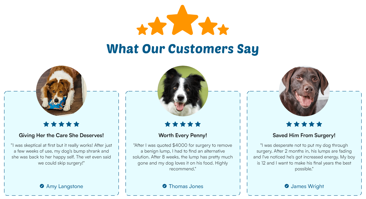 Our powerful formula goes beneath the surface to shrink lumps, calm inflammation, and restore healthy skin-fast. Trusted by 5,000+ pet parents, this vet-endorsed solution helps your dog feel better without the stress (or cost) of surgery. Happy pup, happy you! No harsh treatments. No vet bills. Just real results and a happier, healthier dog.