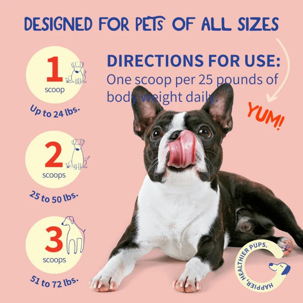 A: Determining the right dosage for your beloved pet is essential for their health and well-being. We've simplified the process based on your dog's size. For petite paws we recommend 1 scoop per day. For mid-sized dogs 2 scoops per day and for grand canines the optimal dosage is 3 scoops per day.