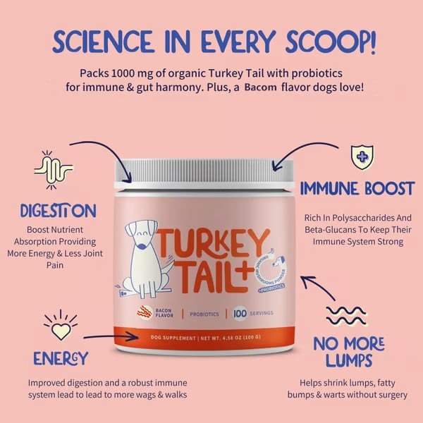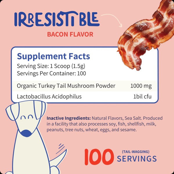 ✅ Just real turkey tail mushroom in a flavorless powder that mixes into your dog's favorite food. Bacon flavor can improve dogs' acceptance of supplements.